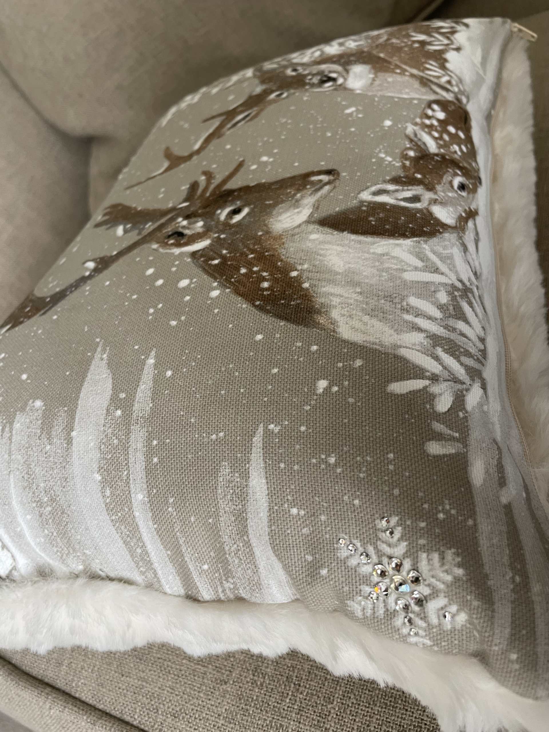 This cushion cover has one side with stags, and snowflakes embellished with top quality Austrian crystals in silver and on the other side is a gorgeous thick cream faux fur.
